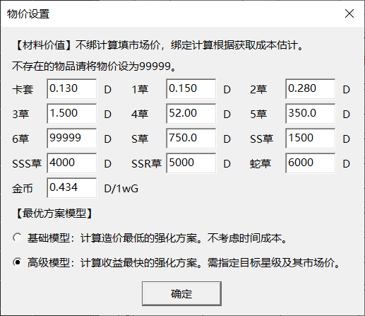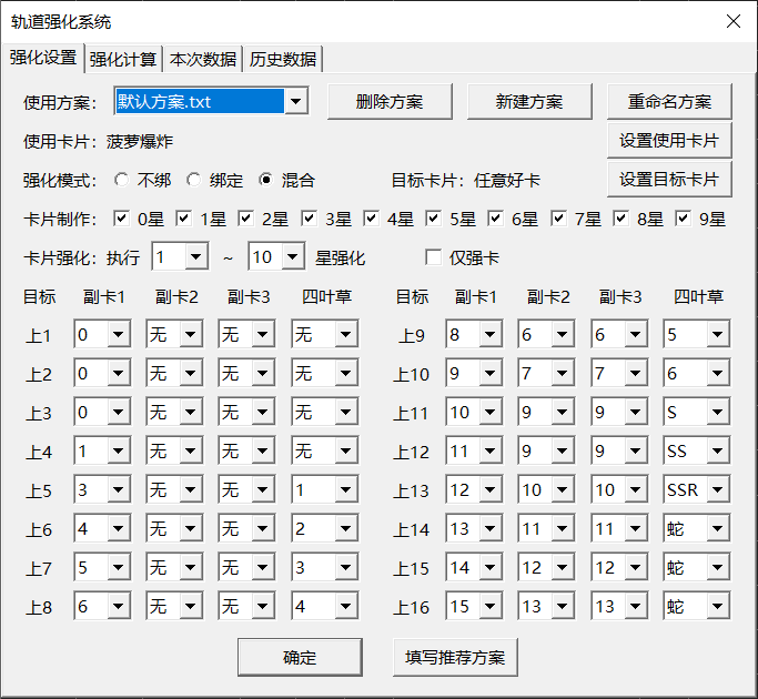 注:单击“填写推荐方案”将会填入一种可行的强化方案,但并非最优方案。不同加成、不同物价下的最优方案可能不同,可以用“强化计算”模块进行计算。