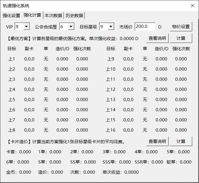 - 卡片造价:计算从卡套出发强化1张目标星级卡片需要的卡套、四叶草、金币和强化次数。计算时使用“强化设置”页面填写的方案。“造价”指消耗的材料按物价设置折算成点券的数量。“单次收益”指1次强化的利润,计算公式为:
