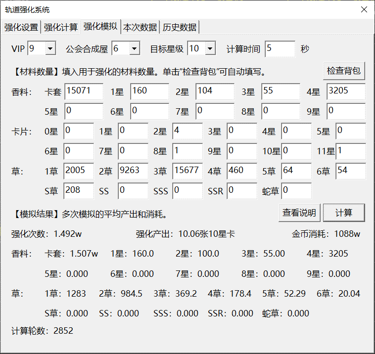 - 计算前需要填写 VIP、公会合成屋等级、强化目标星级、计算时间和材料数量。其中材料数量可以单击“检查背包”自动填写。单击“计算”后,系统将从填写的材料出发,按照轨道强卡算法模拟真实强化过程,直至材料耗尽无法强化(这个过程称为一轮计算)。计算时间越长,计算的轮数越多,结果越接近均值。计算时间填 0 将只进行一轮计算。