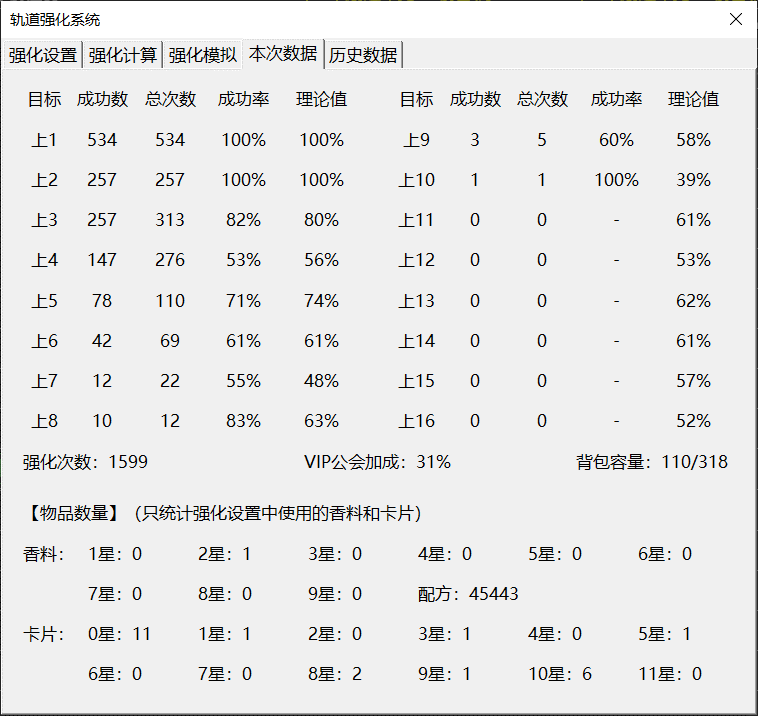 - 本次数据统计正在执行的强化任务的结果(成功数、总次数、实际成功率、理论成功率)及强化材料的实时数量。