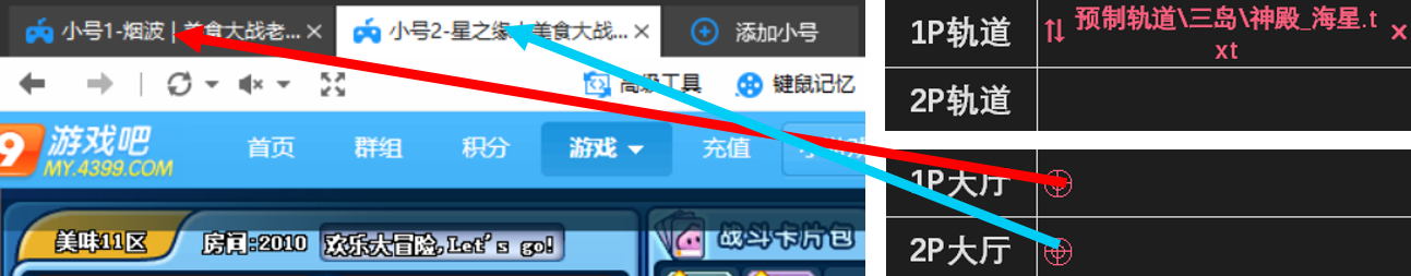 - 记录了两个人物位置的轨道是双人轨道,例如神殿_海星.txt(左图)。将双人轨道拖入执行器的1P轨道位置,然后分别抓取1P和2P大厅(右图),即可由1P放卡带2P刷图。
