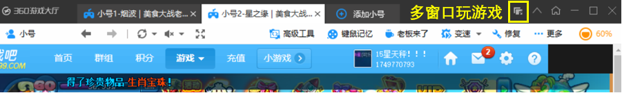 - 存在多个放卡账号时,请点击大厅右上角的多窗口玩游戏按钮让所有放卡账号分开显示。启动后,点击隐藏1和隐藏2可分别隐藏1P和2P窗口。